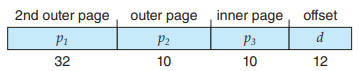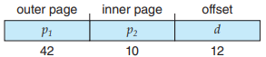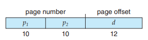 예를 들어, 32bit 논리 주소 공간과 4KB 페이지 크기를 가진 시스템을 생각해보면, 논리 주소는 20bit로 구성된 페이지 번호와 12bit로 구성된 페이지 오프셋으로 나뉜다. 페이지 테이블을 페이징하기 때문에, 페이지 번호는 10bit 페이지 번호와 10bit 페이지 오프셋으로 더 나뉜다. 따라서 논리 주소는 다음과 같다: