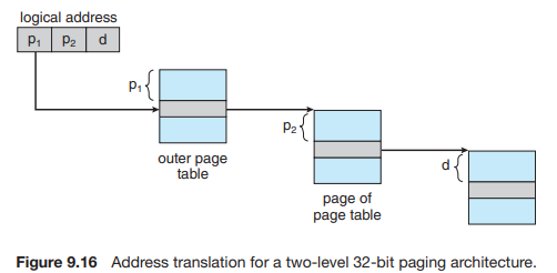 여기서 은 외부 페이지 테이블의 인덱스이고 는 내부 페이지 테이블의 페이지 변위이다. 이 아키텍처의 주소 변환 방법은 그림 9.16에 나와있다.