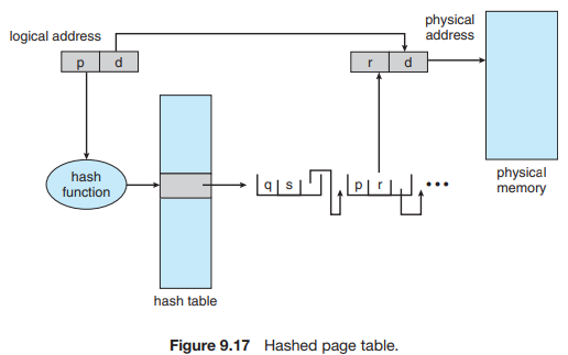 알고리즘은 다음과 같이 동작한다: 가상 주소의 가상 페이지 번호가 해시 테이블에 해시된다. 가상 페이지 번호는 linked list의 첫 번째 요소의 필드 1과 비교된다. 일치하는 경우 패당 페이지 프레임(필드2)을 사용하여 원하는 물리적 주소를 형성한다. 일치하는 게 없으면, linked list의 후속 항목을 검색하여 일치하는 가상 페이지 번호를 찾는다. 이 방법은 그림 9.17에 나와있다.