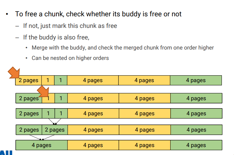 - 할당하기 전 buddy관계였던 두 chunk들이 서로 free됐다면, 합쳐저서 더 큰 공간을 만들어 쪼개지지 않는 상태를 유지한다.