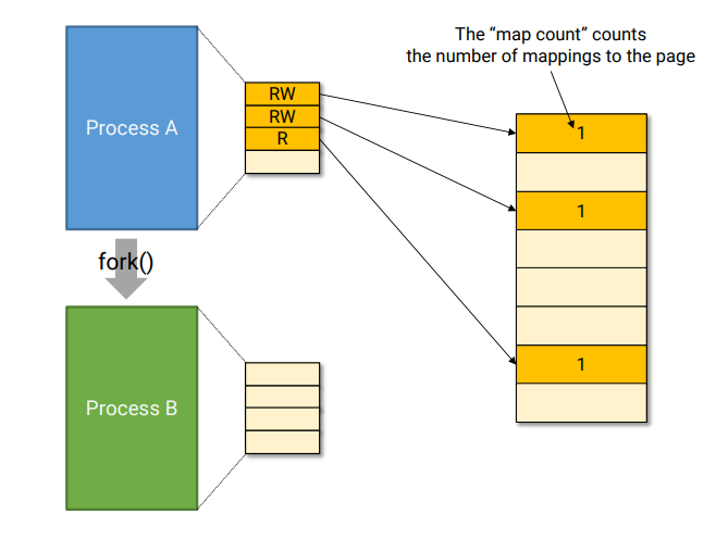 - 이때 frame내의 숫자(ref count)는 그 frame을 참조하고 있는 page의 수이다.