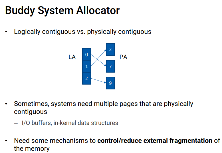 buddy System Allocator: allocate 자체를 2의 n승 만큼을 allocation하고 free하도록 만든다.