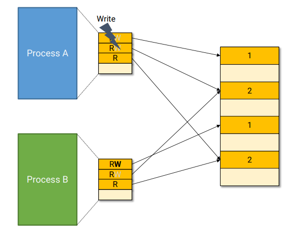 - 프로세스에서 Write를 하게 되면 page fault를 통해서 write를 한 page에 새로운 frame을 할당하여 포인팅하게 만 든다.