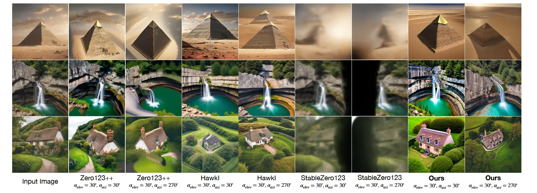 개인적으로 Zero123++의 결과가 더 좋아보이긴 합니다.. 설명으로는 첫번째 피라미드는 그림자가 없고, 두번째 폭포는 부자연스럽고, 세번째 집은 배경이 부자연스럽다고 했습니다.