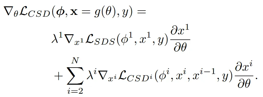 Standard SDS는 super-resolution stage 단계에서는 여러 해상도의 이미지를 동시에 입력받으므로 gradient를 계산한느 것이 직관적으로 명확하지 않아 오직 base stage만을 사용해서 학습했습니다. 해당 논문에서는 SDS 방식을 일반화해서 모든 단계에서 score distillation 신호를 추출하는 방식을 제안(아래 설명)했습니다.