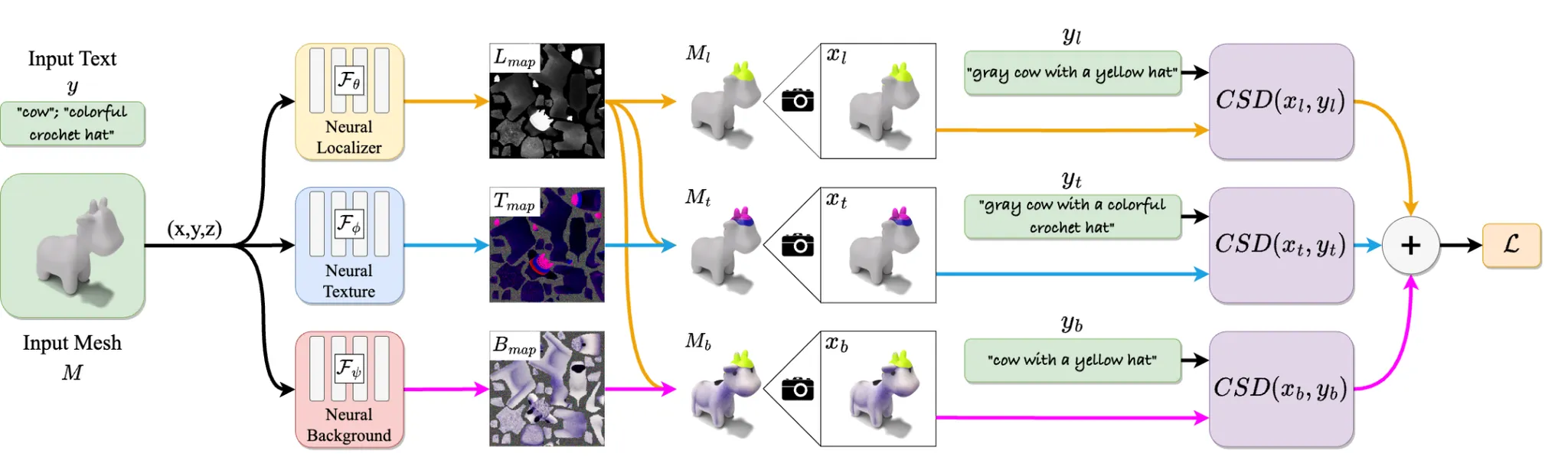 Localization Map()을 Texture Map()에 적용해서 local texture map()을 얻습니다. 해당 Map을 Mesh에 적용한 를 얻고 이를 local-texture text prompt()와 비교해서 loss를 구합니다.