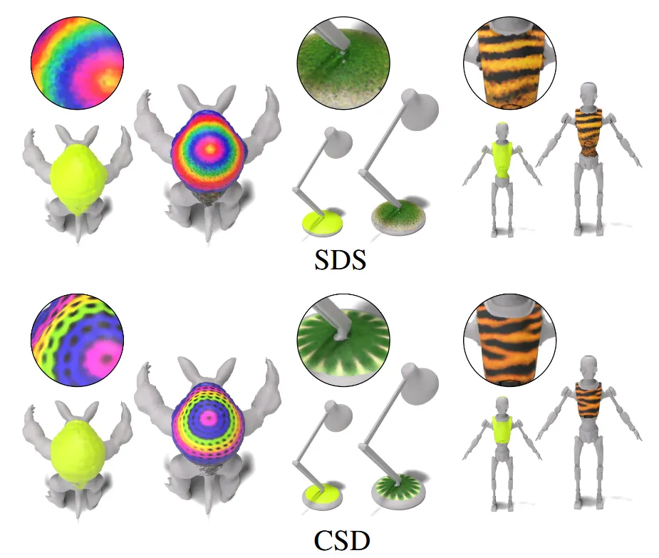 3D Paintbrush는 입력으로 3D 메시(M)와 사용자가 원하는 지역 편집에 대한 텍스트 설명(y)을 받는다. 이 시스템은 텍스트 프롬프트에 맞게 메시의 특정 부분에 정밀하게 텍스처를 수정하는 결과를 출력한다. 텍스트 조건을 3D 메시 편집에 반영하기 위해 학습된 텍스트-이미지 생성 모델에서 얻는 score distillation 기법을 사용한다. 특히, 지역적인 편집은 작은 영역에 대해 더 높은 디테일이 요구되기 때문에, 다양한 해상도의 정보를 동시에 활용하는 Cascaded Score Distillation(CSD) 방식을 도입하여, 세밀하고 자연스러운 텍스처 수정이 가능하도록 한다.