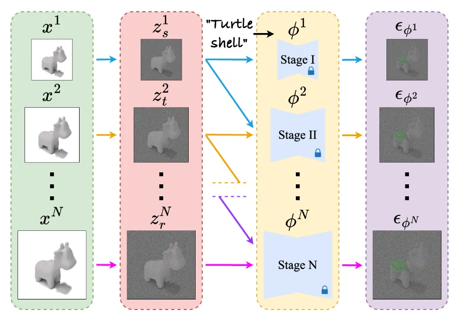 우리가 Diffusion 모델을 통해서 학습하고자 하는 값은 결론적으로 MLP의 하이퍼파라미터 입니다. 우선 Mesh 로부터 N개의 서로다른 해상도 이미지를 렌더링합니다. 이 해상도는 각 Stage에서 사용할 이미지의 해상도와 동일합니다.