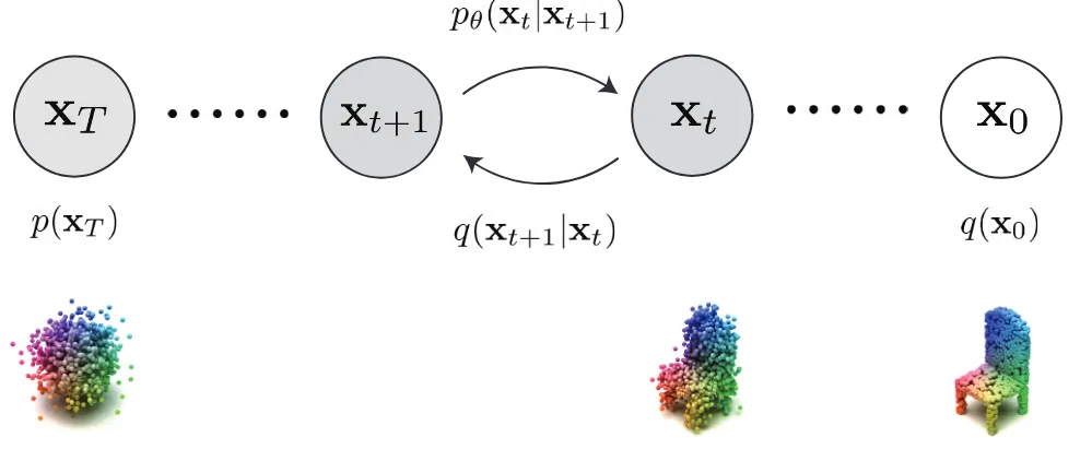 일반적인 diffusion 모델처럼 T시점은 Gaussian noise이고, 시점은 이미지가 아닌 여기서는 우리가 원하는 형태의 point cloud를 갖습니다. 첫번째 수식은 노이즈를 추가하는 forward process, 두번째 수식은 노이즈를 제거하는 reverse(generative) process입니다.