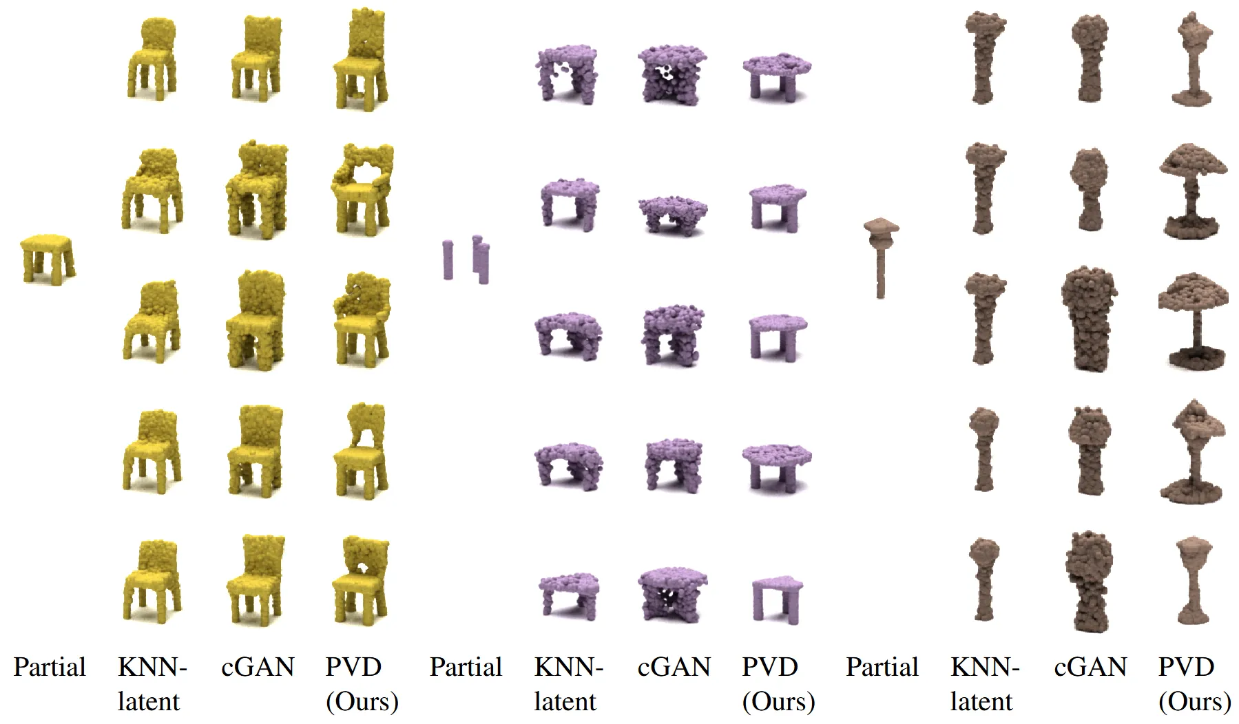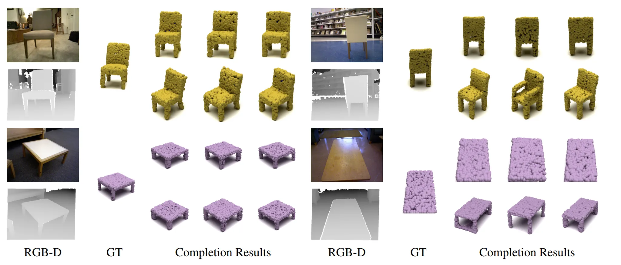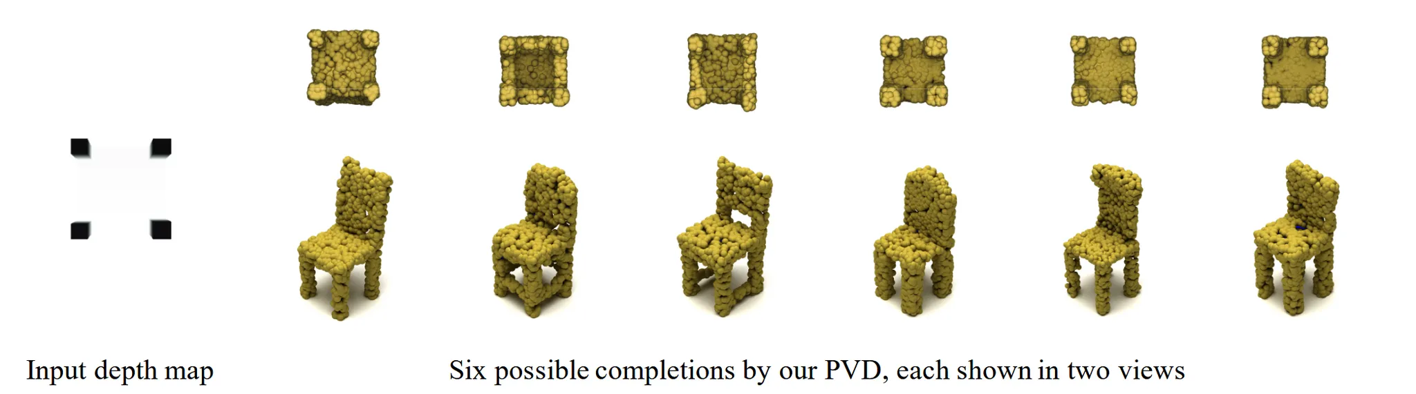 Diffusion 모델을 사용했기 때문에 같은 Partial shape을 주더라도 서로 다른 결과가 나올 수 있습니다. 참고로 여기서 말하는 multi-modal은 여러개의 modality를 입력으로 사용했다는 것이 아닌 1개의 입력으로 다양한 결과를 나타낼 수 있다는 의미로 사용했습니다.