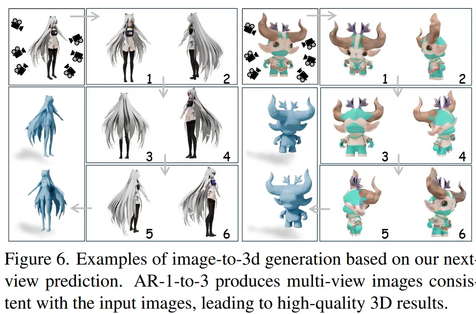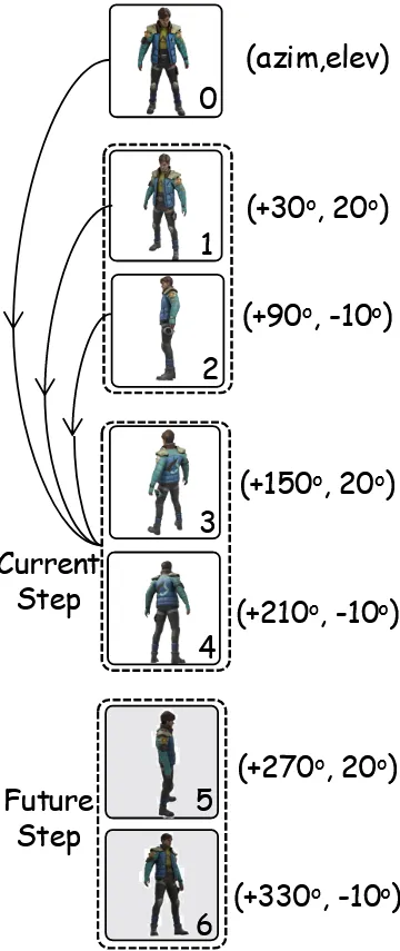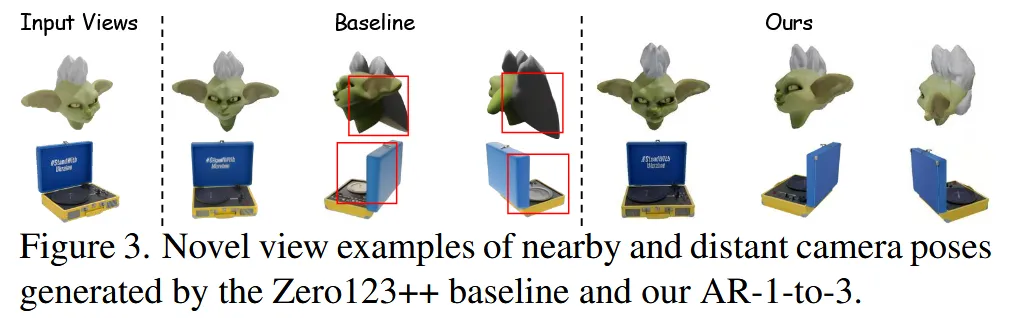Baseline model이 6개의 이미지를 한번에 생성한다면, AR-1-to-3는 하나씩 순차적으로 이미지를 생성합니다. Zero123++에서 3x2 grid 이미지를 한번에 생성했고 비슷한 방식이지만 AR-1-to-3는 2개씩 총 3번을 순차적으로 생성하게 됩니다. 2개를 생성할 때 이미지들은 방위각 90도, 고도 30도의 차이를 갖고, 다음 단계로 넘어갈 때 방위각만 120도 차이가 생기도록 설정했습니다.