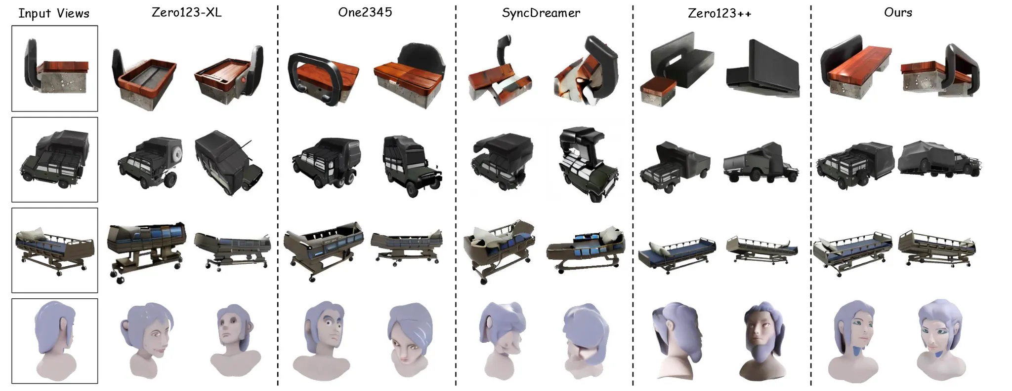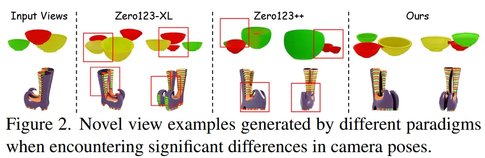 Zeor123, Zero123++처럼 기존 NVS(Novel View Synthesis) 논문들은 새로운 시점의 이미지가 입력 이미지와 gap이 존재하는 것을 확인할 수 있습니다. 예를들어서 ZEro123-XL에서는 그릇 개수가 더 많아지거나, 초록색 문양이 생기고, Zero123++도 마찬가지로 그릇 개수가 달라지고, 신발이 하나로 합쳐지는 것을 확인할 수 있습니다. 이러한 이유는 모든 뷰에 대해서 동일한 우선순위 방식을 적용하기 때문입니다.