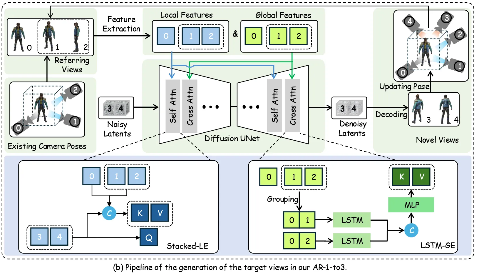 지금까지 Zero123++와 큰 차이가 없고 이렇게 6개의 뷰를 얻고 InstantMesh를 이용해서 3D를 생성합니다. 이제 2가지 큰 차이점인 Stacked Local Feature Encoding와 Long Short-Term Global Feature Encoding를 설명하겠습니다.