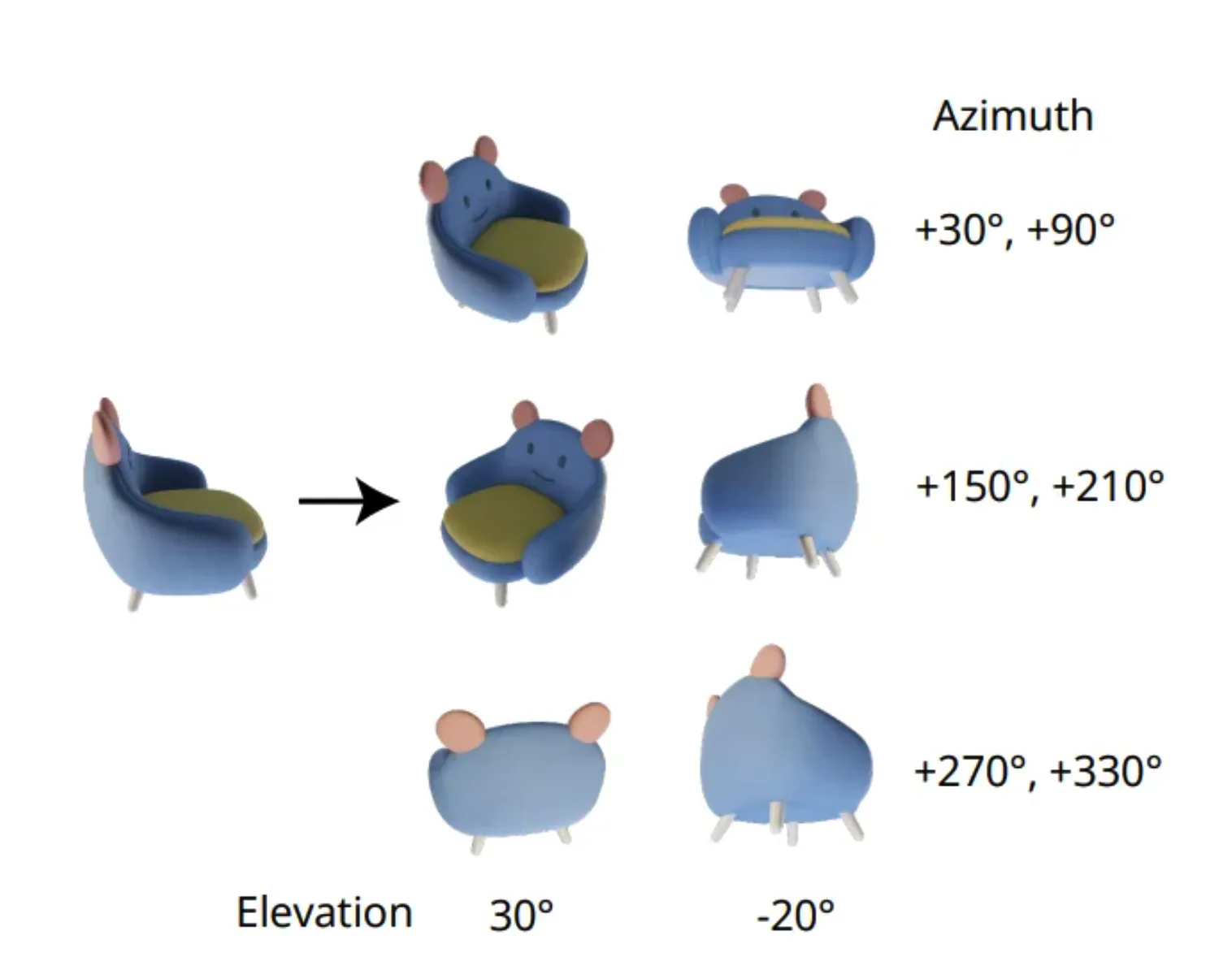 Zero123++의 카메라 방향인데 비교해보면 방위각은 그대로이지만 고도가 30,-20이 아닌 20,-10만 바뀐 것을 확인할 수 있습니다.