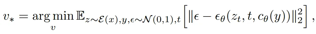 학습의 목표는, 이전에 설명한 LDM loss를 최소화하는 를 찾는 것입니다. 수식적으로는, condition(y)을 “A photo of ”로 주고, 이에 대응하는 임베딩 벡터 를 최적화하는 방식입니다. 기존 LDM에서 학습하는 네트워크 파라미터(𝜃와 )는 고정시키고, 오직 와 만 학습하도록 설계한 것이 특징입니다.