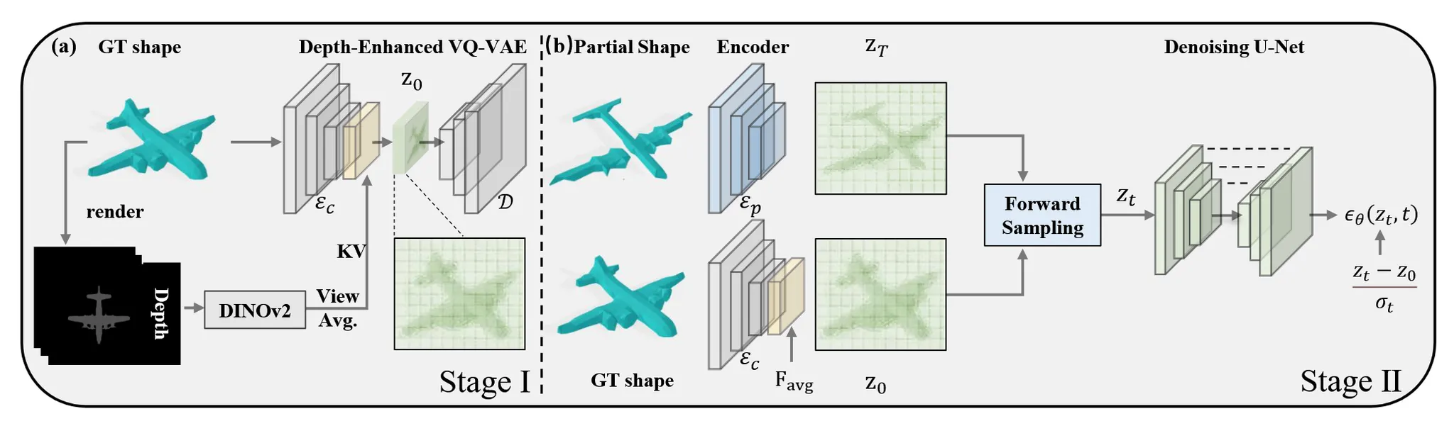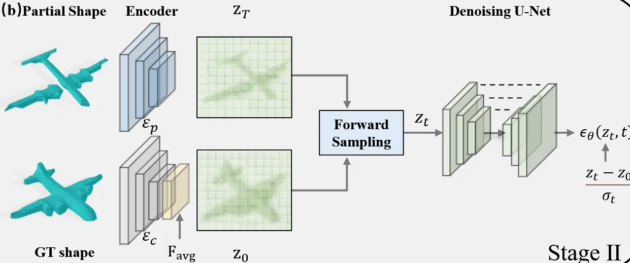 이전에 학습한 VQ-VAE는 freeze시키고, 이를 통해서 불완전한 shape으로부터 인코딩한 latent를 얻고, 이 latent를 완전한 shape의 latent로의 변환 과정을 학습해야 됩니다. 기존 논문들은 랜덤 노이즈로부터 정답을 얻었지만 해당 논문에서는 불완전한 입력에서 시작해서 완전한 정답으로 가는 경로를 모델링