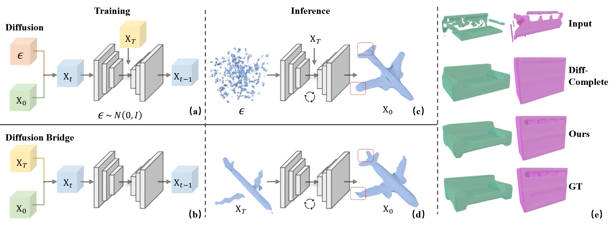 3D shape completion 방법은 일반적으로 diffusion 모델을 사용할 때 concat하거나 cross-attention을 사용해서 복원했습니다. 이때 어떻게 불완전한 것에서 완전한 것으로의 변환을 나타내는지에 대한 transport path를 모델링 하지 않았기 때문에 부적절한 결과를 만들었습니다.