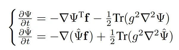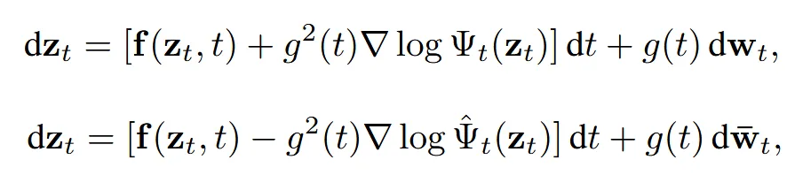 이 과정은 확률적 미분 방정식(SDE)으로 정의되며, forward/backward 방향 모두 추가 drift (∇logΨ)이 포함된 형태입니다. 하지만 이 SDE를 직접 푸는 것은 계산 비용이 크므로, 최근에는 paired data를 이용해 근사하는 방식이 사용됩니다.