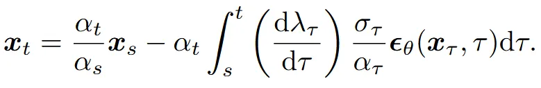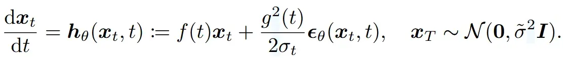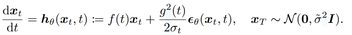 t시점에서 SDE와 동일한 marginal distribution을 갖는 ODE를 probability flow ODE라고 명명했고, score function을 noise prediction model의 형태로 바꿀경우 아래와 같이 나타납니다.
