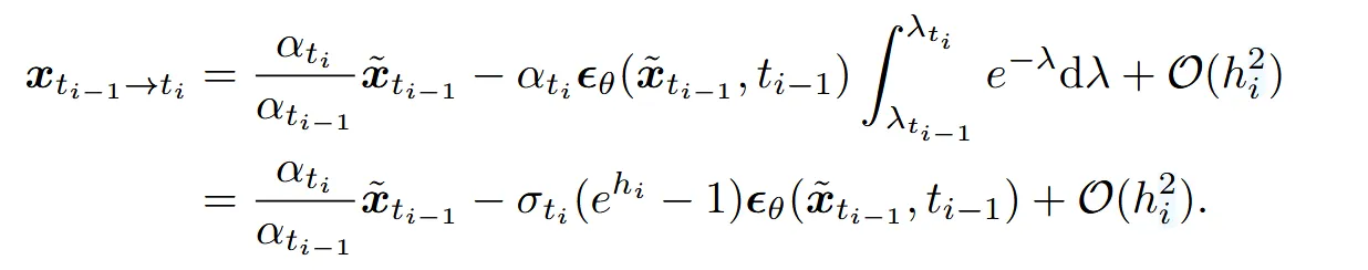 첫번째로 i와 i-1의 λtλ_t의 값의 중간값인 sis_i를 3번째 줄에서 구합니다. 이후 중간값인 uiu_i를 i와 i-1의 중간 시간 값(hi/2h_i/2)으로 나타냅니다. 5번째 줄에서는 중간값을 이용해서 노이즈를 예측하고 최종적으로 i시점의 값을 예측하게 됩니다. 이때 hi가 절반이 아닌 원래의 값을 이용한 이유는 노이즈의 예측만 중간 시점에서 한 것이지 앞의 x~ti1\tilde{x}_{t_{i-1}}를 사용해서 i시점을 예측했기 때문에 시간 간격은 hih_i를 그대로 사용해야됩니다.