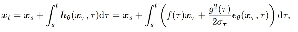 variation of constants 공식을 적용한 결과는 위와같습니다. linear와 non-linear부분을 분리함으로서 linear 부분은 approximation error를 제거하면서 계산할 수 있는 형태로 나타낼 수 있습니다. 하지만 여전히 non-linear 부분의 경우 f(r), g(r), σrσ_r과 복잡한 neural network ϵθ\epsilon_{\theta}로 나타나 있어서 매우 복잡합니다.