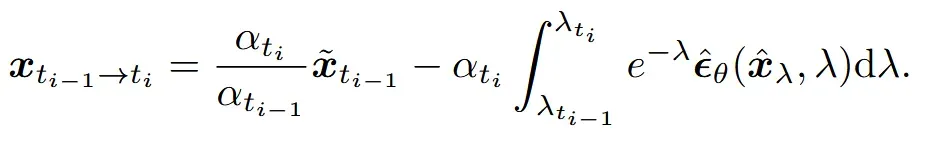 T부터 M까지 M+1개의 time steps들에 대해서 t0t_0=T, tMt_M=0으로 나타냅니다. 제안된 solver는 x~ti\tilde{x}_{t_i}로 나타냅니다. 마지막 값을 나타내는 x~tM\tilde{x}_{t_M}는 시간 0에서의 추정된 값입니다. 추정 오차를 줄이기 위해서는 각각의 step에서 x~ti\tilde{x}_{t_i}를 줄일 필요가 있습니다. ti1t_{i-1}에서 tit_i로의 변환은 아래와 같은 수식으로 나타낼 수 있습니다.