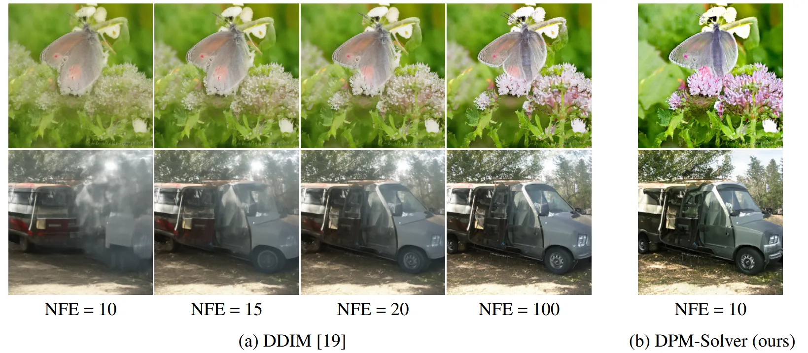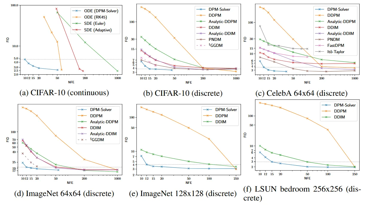 위의 사진은 DDIM에 비해서 적은수의 NFE(number of function evaluations)로도 더 좋은 결괄르 보이는 것을 알 수 있습니다.