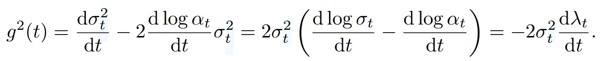 λtλ_t는 SNR로서 시간이 증가할수록 감소하게됩니다. 해당 변수를 이용해서 g2(t)g^2(t)를 나타내면 위와 같이 간소화할 수 있습니다. SDE 수식 f (t) = d log αt/dt 값과 위에서 구한 g2(t)g^2(t)λtλ_t로 변환한 식을 대입하면 아래와 같은 최종식을 얻을 수 있습니다.