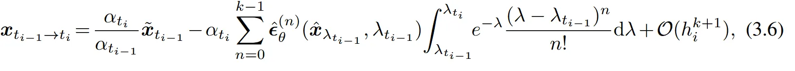 위의 식은 ϵθ\epsilon_{\theta}에 대한 k-1차 Taylor 급수 방정식입니다. 이를 이전의 tit_iti+1t_{i+1}로 변환한 수식에 대입하면 최종적으로 아래의 수식을 얻게됩니다.