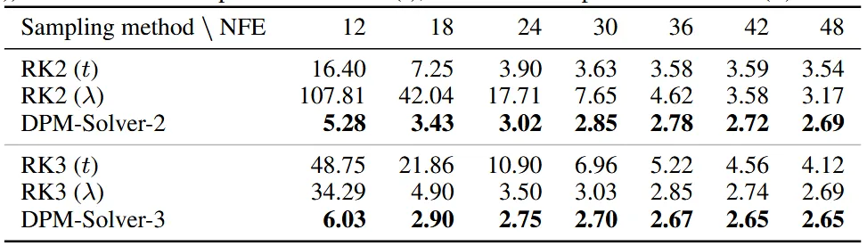 위에서 설명한 RK방법과 DPM-Solver 방법을 동일 차에서 비교한 결과입니다. CIFAR-10데이터를 기준으로 다양한 number of function evaluations(NFE)의 값에 따른 FID 값을 나타낸 것입니다. RK2 다음에 나타난 t와 λ\lambda는 uniform time step을 time step기준으로 할지, 아니면 SNR 값을 기준으로 할지를 나타낸 것입니다. 결론적으로 DPM-Solver가 RK보다 성능이 좋고, 당연히 NFE가 증가할수록 성능이 좋음을 나타냈습니다. 특이한 점은 2차에서는 time step을 time으로 동일하게 나눈 수치가 SNR을 기준으로 나눈 수치보다 좋게 나왔지만, 3차에서는 반대로 나왔습니다.