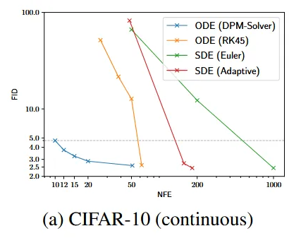 첫번째로 continuous-time sampling 방법에 대해서 비교해 보겠습니다. Diffusion SDE쪽에서 Euler-Maruyama를 사용한 방법과, adaptive step size를 적용한 방법에 대해서, Diffusion ODE쪽에서는 RK 모델에 대해서 비교했습니다. 이 모델들을 “VP deep”으로 사전학습된 모델을 기반으로 CIFAR-10 데이터셋을 샘플링하게 됩니다. Adaptive SDE의 경우 uniform한 time step과 함께 50,200,1000개의 NFE의 결과를 얻었고, Adaptive SDE의 경우 시간 간격을 상황에 따라 동적으로 조정했습니다. RK45 ODE의 경우 4차와 5차 Runge-Kutta 방법을 사용해서 adaptive step size를 사용하여 더 효율적인 계산을 하도록 설정했습니다. 결론을 본다면 NFE가 10일 때 DPM-Solver가 FID score가 약 5를 달성한 것으로 다른 모델들에 비해서 5배 이상 빠른 결과를 얻었습니다.