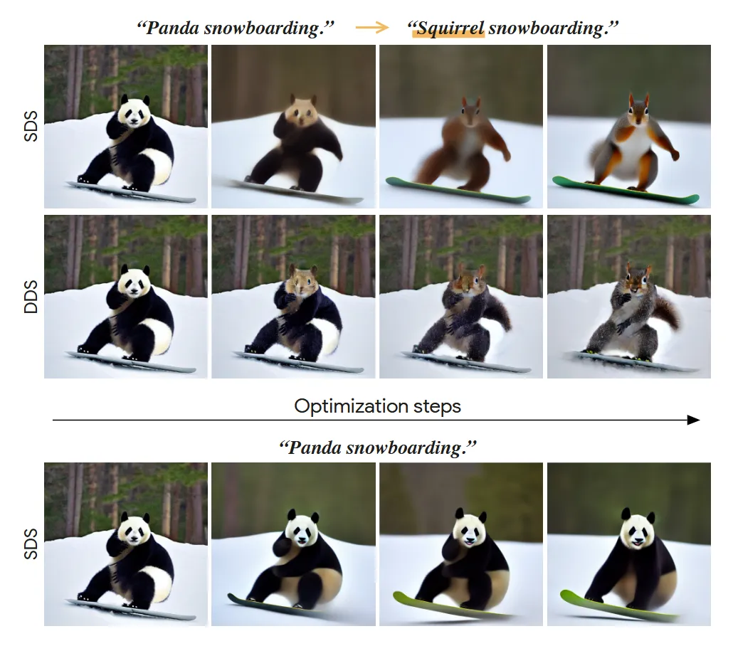 Image의 변형을 가하는 기존 SDS 방법은 위에서 봤던것처럼, 원본 이미지에 노이즈를 더한 다음에 CFG를 활용해서 text prompt를 반영합니다. 맨 위의 결과를 보면 panda를 squirrel로 변경했을 때 다람쥐로 바뀌기는 하지만 결과가 blur해지는 것을 확인할 수 있습니다.