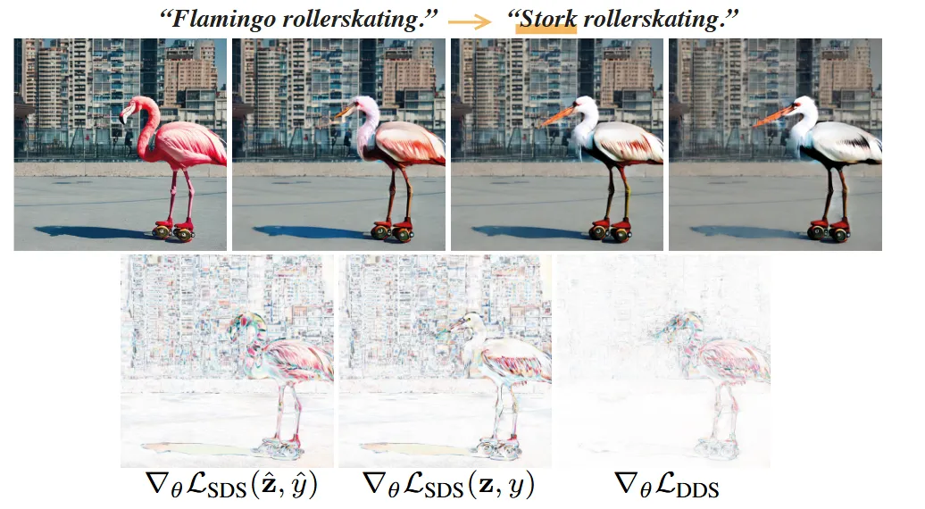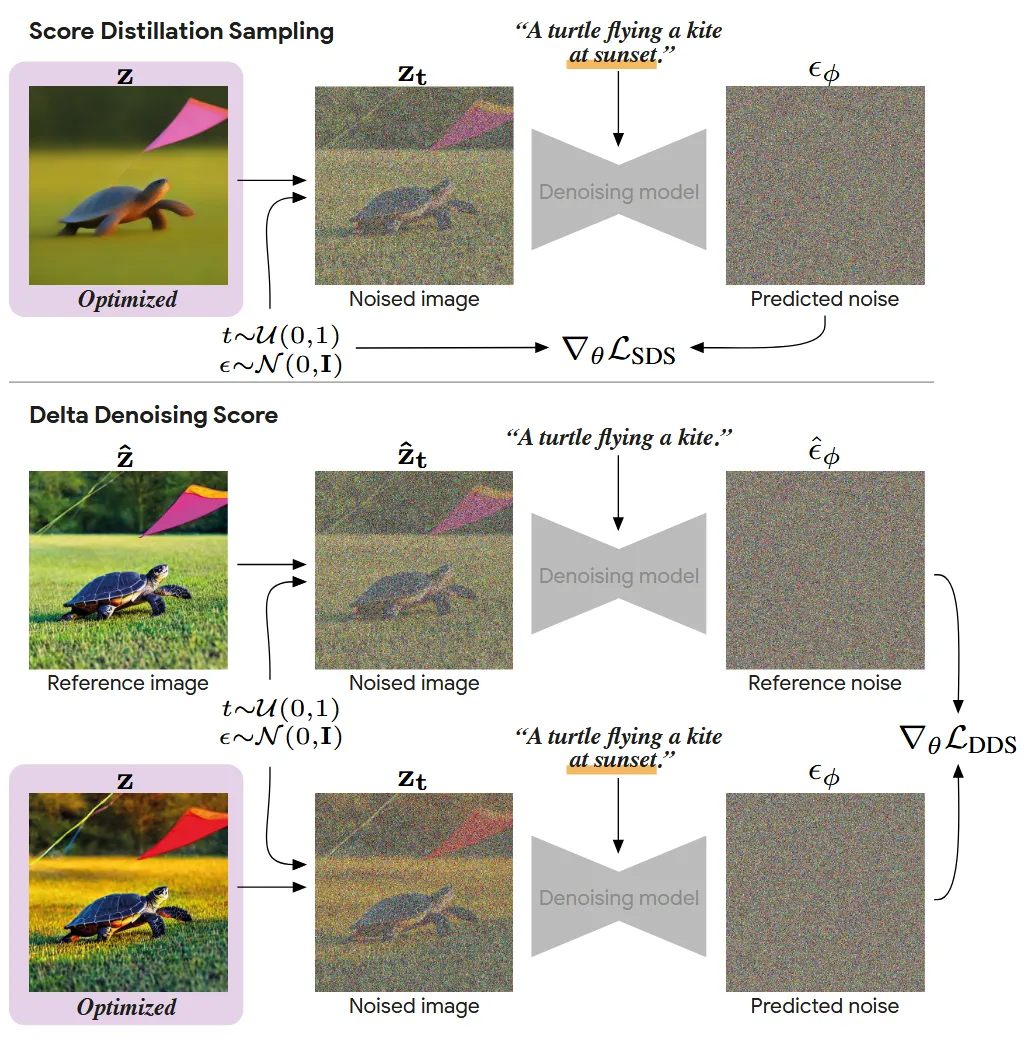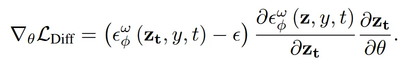 이때 DDS의 수식은 위와 같습니다. 와 는 동일한 sampled noise와 timestep t를 사용합니다.