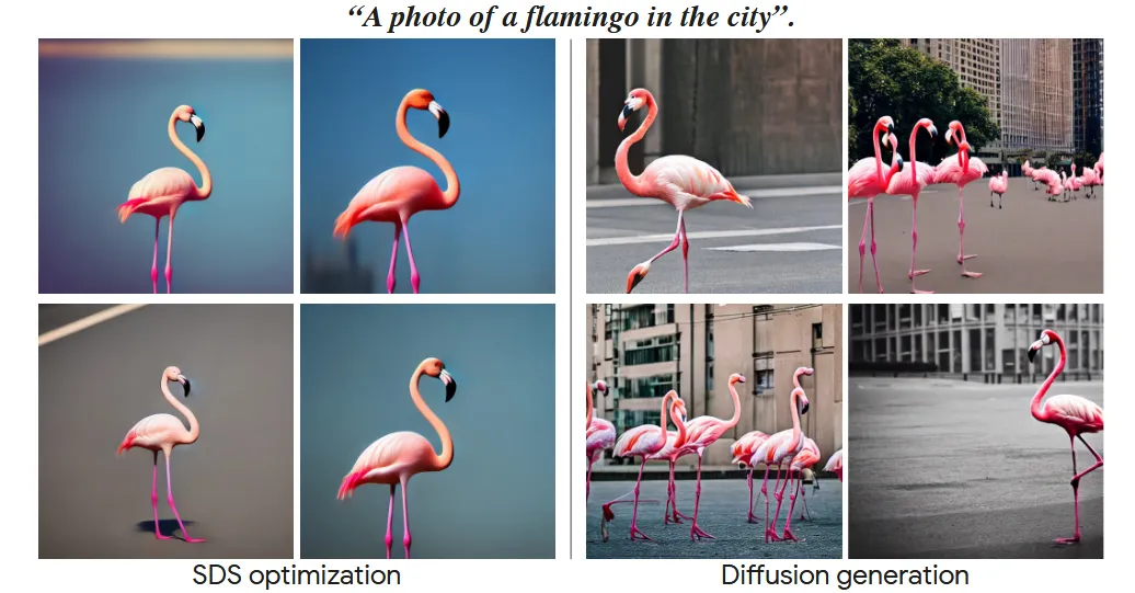 파라미터를 업데이트하면서 점점 text prompt에 맞는 이미지를 생성하게 됩니다. 하지만 SDS는 다양성이 떨어지고 blur한 결과가 나옵니다.