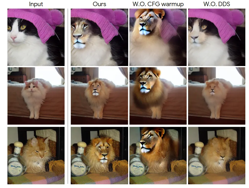 GAN(Generative Adverserial Network)에서 판별자만 속이면 되기 때문에 특정한 형태로 빠지는 mode collapse 문제가 DDS에서도 text prompt에 맞는 형태로만 바꾸면 점수가 높아지기 때문에 동일하게 발생합니다. 따라서 어떤 이미지가 들어가든, 어떤 텍스트 프롬프트가 들어가든 위의 결과처럼 특정한 사자의 형태로 고정되는 것을 확인할 수 있습니다.
