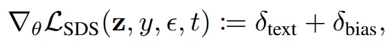 DDS에서는 SDS에는 text prompt에서 text에 맞게 유도하는 부분과, bias를 주는 부분 2가지로 나눌 수 있다고 제시했습니다. 위의 수식처럼 text-aligned 부분인 와 의도하지 않은 방향으로 유도하는 2가지 부분으로 나눌 수 있다고 제시했습니다.