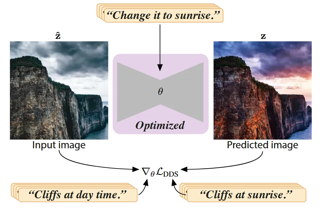 Text condition이 기존에는 source와 target 2개가 필요했는데, 1개만을 이용하기 위해서 위의 학습 방식을 사용합니다. 새로운 학습 방식으로 2 문장의 차이(예: Change it to sunrise) 부분만을 기반으로 2개의 text prompt와 2개의 image의 차이를 학습하는 기존모델에 새로운 condition으로 넣어서, 추론시에는 문장의 차이만으로도 동일한 결과를 낼 수 있도록 합니다.
