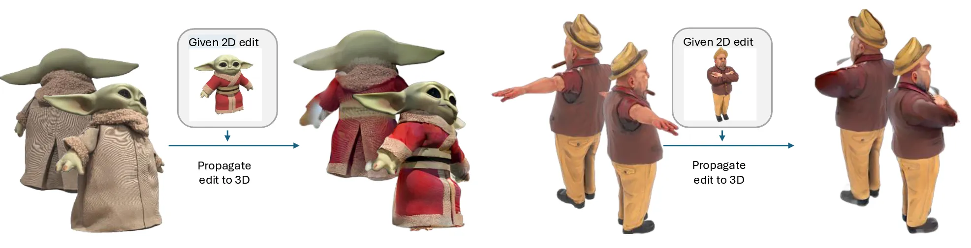 이 논문은 Delta Denoising Score(DDS)나 FlowEdit에서 제안된 방식처럼, edit-aware denoising 기법을 사용합니다. 핵심 아이디어는 원본 이미지(original prompt)와 사용자가 수정한 이미지(target prompt)의 차이를 계산하여 edit direction이라는 벡터를 구하고, 이 방향을 따라 전체 3D 이미지들을 수정해 나가는 것입니다. 이 과정을 통해 2D 편집 내용을 3D 구조에 일관되게 반영할 수 있습니다.