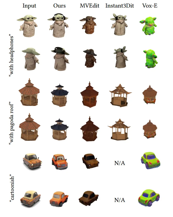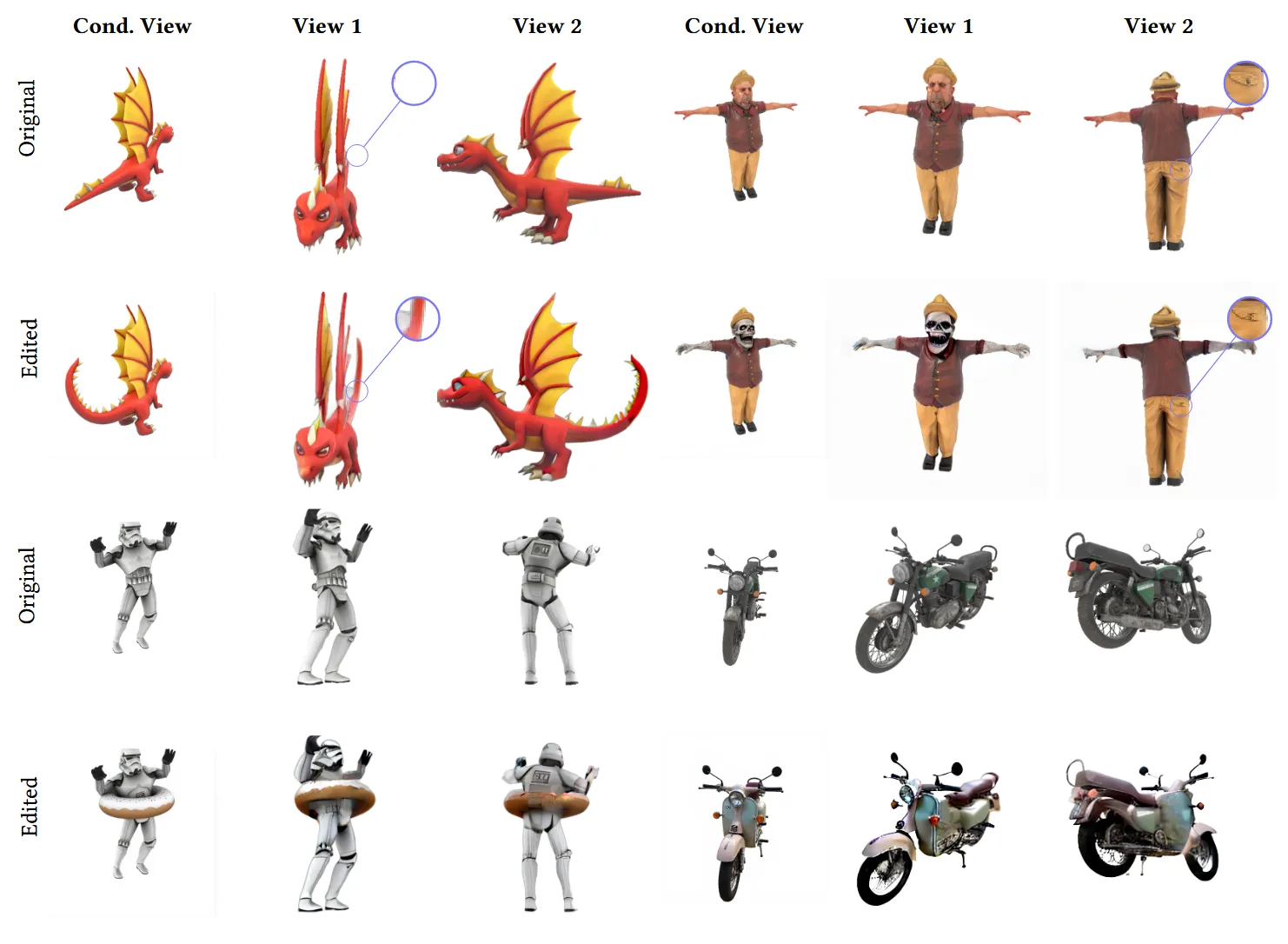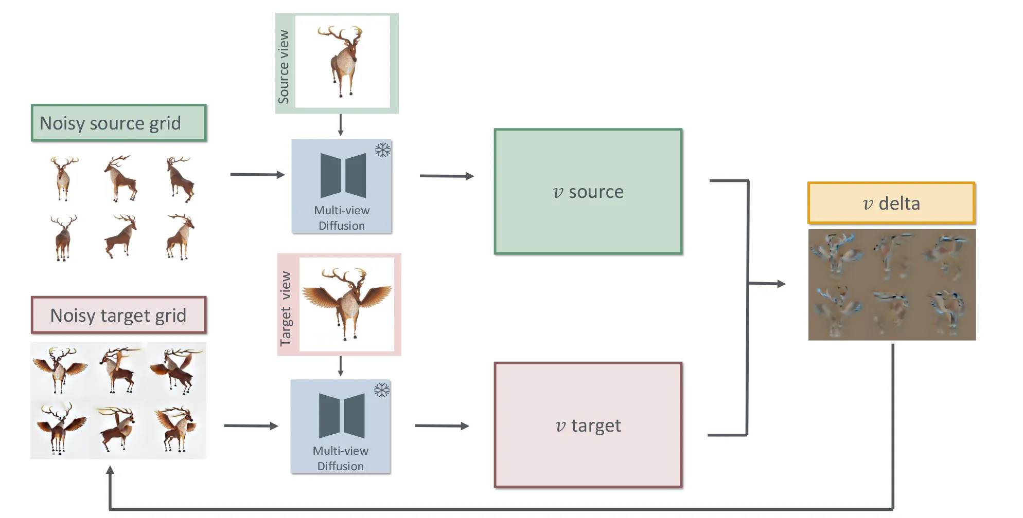 그림을 보면 구조를 더 쉽게 이해할 수 있습니다. diffusion 모델 Zero123++에 원본 이미지를 조건으로 넣으면, 각 뷰에 대한 예측된 변화 방향(velocity)이 나옵니다(v source). 반면, 사용자가 수정한 이미지를 넣으면 또 다른 예측 결과 (v target)가 나오고, 이 둘의 차이인 edit direction이 바로 우리가 원하는 편집 방향입니다. 이 edit direction을 활용해, 현재 denoising 중인 multi-view grid를 점진적으로 수정하며 최종 결과를 생성합니다.
