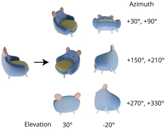 Mv-grid를 생성하기 위한 Multi-view diffusion model로는 Zero123++를 사용했습니다. 해당 모델은 입력 이미지를 넣으면 정해진 6개의 시점의 이미지를 1개의 grid로 생성하는 모델입니다.
