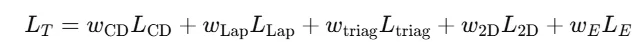 최종적으로 CD, Laplacian, triangle, 2D Supervision, Embedding loss를 모두 더하도록 loss를 설계 했습니다.