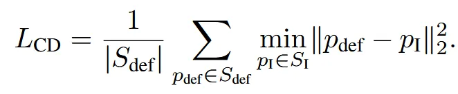 1차원 Chamfer Distance(CD) loss를 통해서 최종 출력되는 Mesh가 pseudo-ground-truth mesh의 형태를 따르도록 학습합니다. Chamfer distance는 방향성이 존재하고 논문에서는 단방향으로 deformation 결과가 target을 따라가도록 유도합니다. 여기서 유도하는 값은 point cloud 간의 geometric similarity입니다.