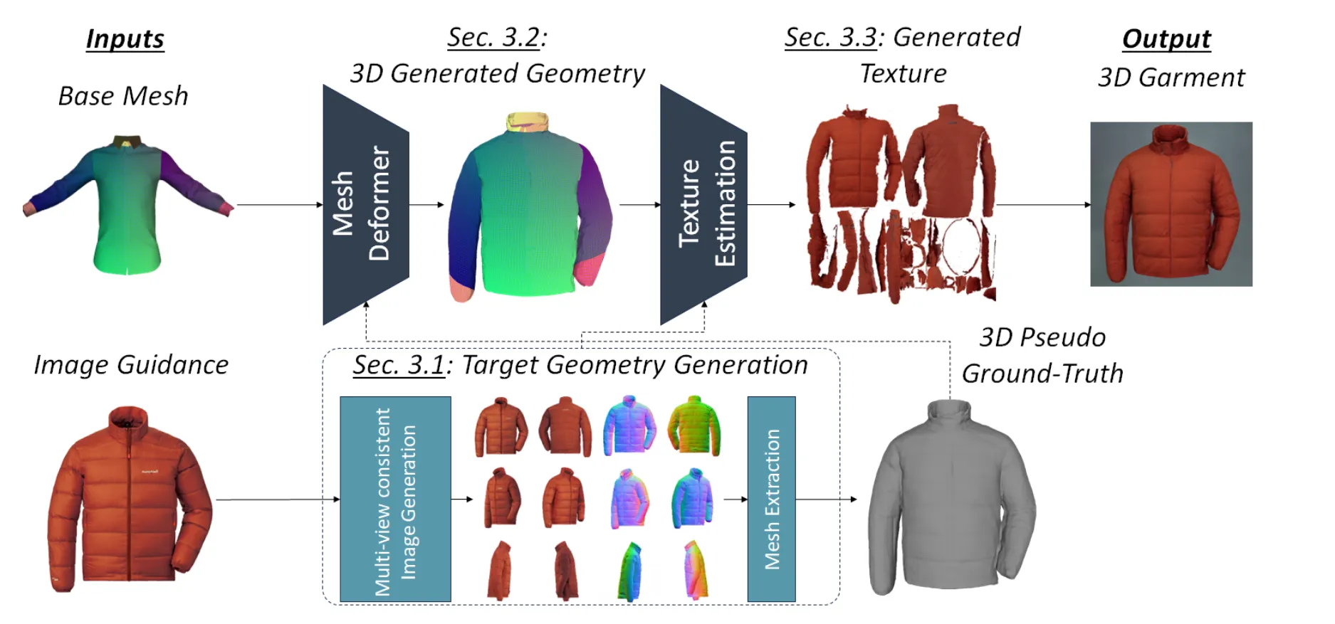 Input으로 Image혹은 Text로 내가 원하는 형태의 옷을 넣으면 해당 input을 기반으로 사람이 옷을 입고 있는 결과가 나오는 모델입니다. 3D Deformation을 궁금해하던 중 아이디어를 가져올 수 있을거같아서 Deformation 부분을 중심적으로 읽어보도록 하겠습니다.