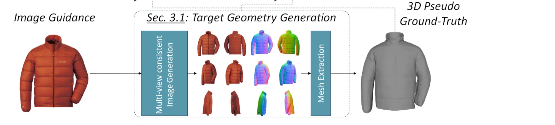Textdeformer: Geometry manipulation using text guidance 논문에서는 하나의 이미지를 기반으로 3D를 Deformation했는데 이럴 경우 단순히 CLIP 만을 이용하기 때문에 제약이 부족하고, 결과가 어색하거나 과도하게 변형되고, 미세한 디테일을 놓치게 됩니다. 따라서 Zero123++나 Wonder3D를 이용해서 새로운 시점의 6개 RGB와 normal을 생성한 뒤, 이를 기반으로 LRM(Large Reconsturction Model)을 이용해서 3D Pseudo Ground-Truth를 생성한 후 이를 기반으로 Deformation을 진행하는 것 입니다.
