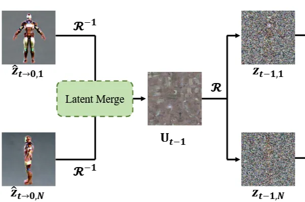 다른 논문들에서도 latent space상에서의 aligment를 진행했지만, 이전 논문들에서 진행한 결과는 texture가 너무 단조로워지는 결과를 나타냈습니다. 따라서 새로운 latent merge pipeline을 해당 논문에서 제시했습니다.