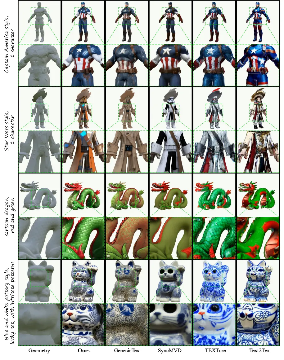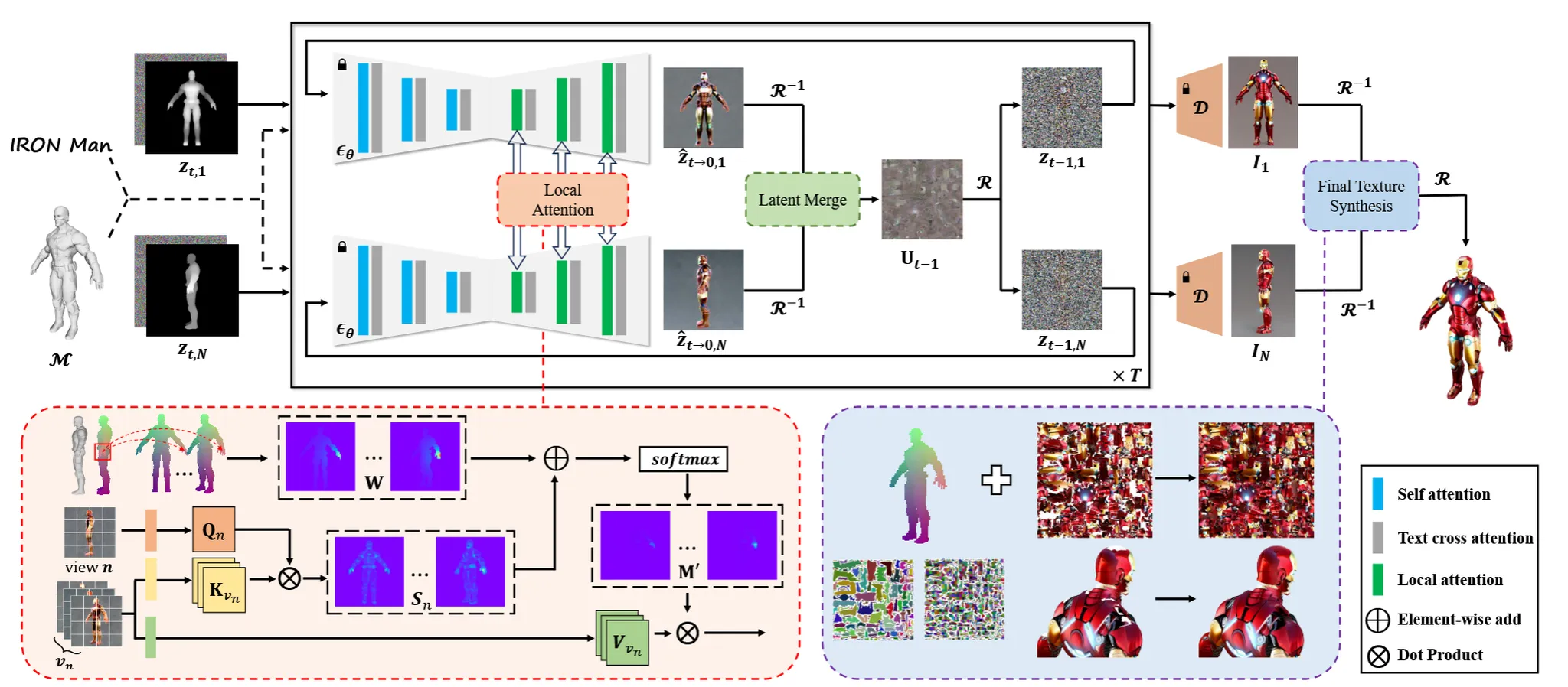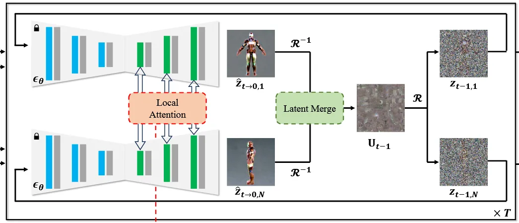 그림상으로는 위와 같습니다. T시점에서 시작해서 local attention, latent merge를 통한 texture update, update된 texture를 렌더링해서 다시 T-1시점의 z값을 얻고 이를 다시 T-2, T-3 …0 시점의 결과를 얻는 것입니다. 참고로 마지막 5 step에서는 latent merge를 수행하지 않아서 저해상도 latent를 reprojection해서 artifact가 발생하는 것을 방지했습니다.