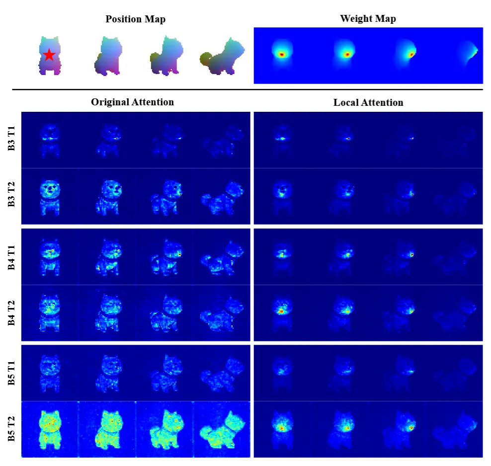 그림을 통해서 local attention의 알고리즘을 최종적으로 파악해보겠습니다. 기존에 U-Net의 self-attention부분을 cross-attention으로 바꿔서 다른 뷰()에 대해서 진행을 하는데, 그냥하면 texture가 단조로워지는 문제가 발생합니다. 이를 극복하기 위해서 attention bias matrix(W)를 추가해서 softmax를 취하게 돼서 시점별로 동일한 부분에 대해서 동일한 위치에 대한 부분의 attention을 얻게 됩니다.