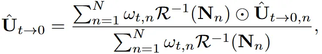 위의 수식에서 은 consine similarity map으로 각 픽셀별로 normal vector와 view direction의 코사인 결과입니다. 은 view n에서의 가중치를 나타냅니다. 초기에는 해당값이 1이지만 을 선형적으로 interpolation으로 값이 변합니다. 이때 는 view point 과 사이의 각도이고, γ는 하이퍼파라미터입니다.