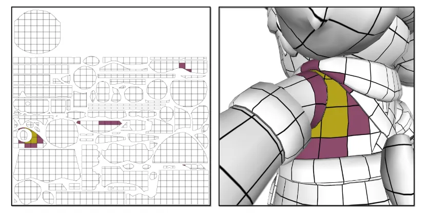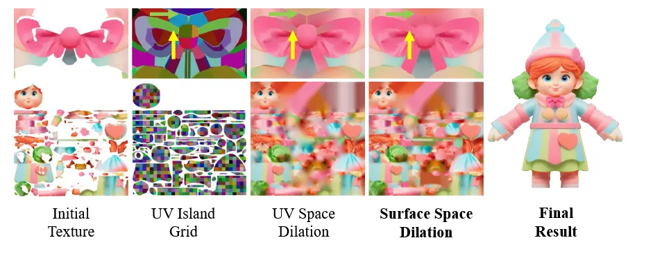 Surface space dillation을 이용한 결과는 위와 같습니다. 2D UV space상에서 dillation한 결과보다 훨씬 더 자연스럽게 픽셀값이 확장 된 것을 확인할 수 있습니다. 참고로 UV Island Grid가 이상하게 보이는 이유는 영역을 구분하기 위해서 단순히 색깔을 다르게 한 것 입니다.