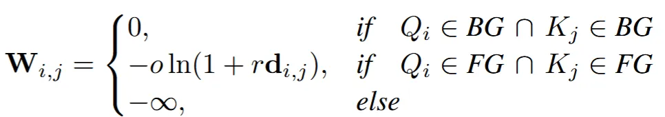 Position map끼리의 거리를 구하면 최종적으로 Attention bias matrix(W)를 구합니다. 우선 각 패치가 Background(BG)인지 Foreground(FG)인지 확인해야 합니다. 2개의 값을 어떻게 구한다고는 나와있지 않지만 일반적으로 position map이 0이면 해당 부분이 BG가 될 것입니다. 어쨌든 패치별로 BG냐 FG냐를 나타내고, 그 값을 기반으로 W를 구해서 softmax를 취하기 전에 더해줍니다.